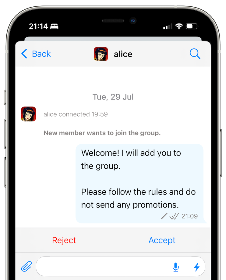 - decide whether to allow them joining the group, and whether they should be able to send messages in the group.